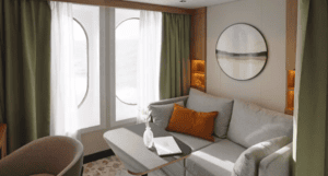 Vista para o mar M4 – Localizado no Deck 4 na proa. Leves, luminosos e feitos de materiais naturais As cabines com vista para o mar (19 m2) apresentam 2 camas de solteiro, quarto e sala de estar e um luxuoso banheiro privativo.