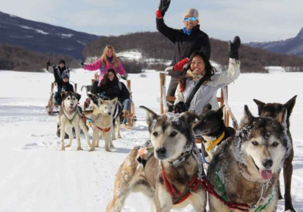 Experiência de trenó com huskies em Ushuaia, com visita ao Husky Park, passeio de 7 km na neve, lanche incluso e interação com os cães.