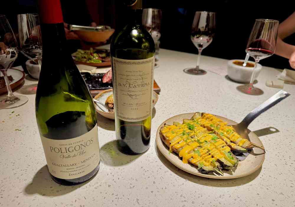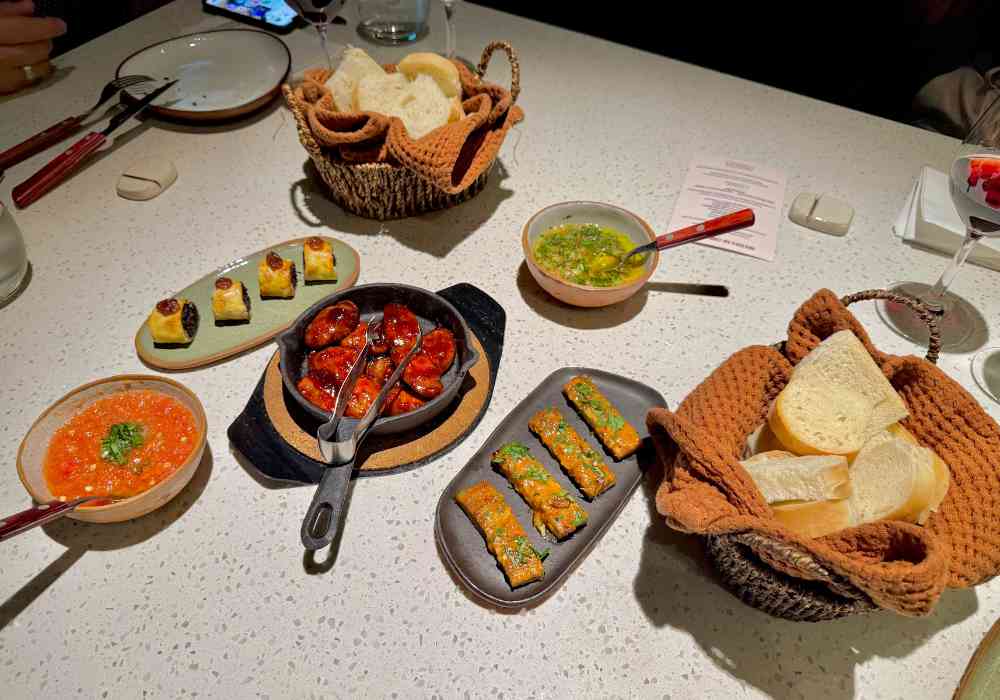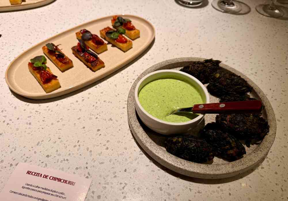 O menu segue em etapas, cada uma harmonizada com vinhos argentinos selecionados com cuidado. Entre os destaques estão os bolinhos de acelga e a farinata de grão-de-bico dourada, que remetem à comida caseira e às memórias afetivas. Em seguida, chegam pratos típicos como o chouriço, o enroladinho de linguiça preta e o bife de fraldinha de porco, representando o sabor das mesas argentinas.
